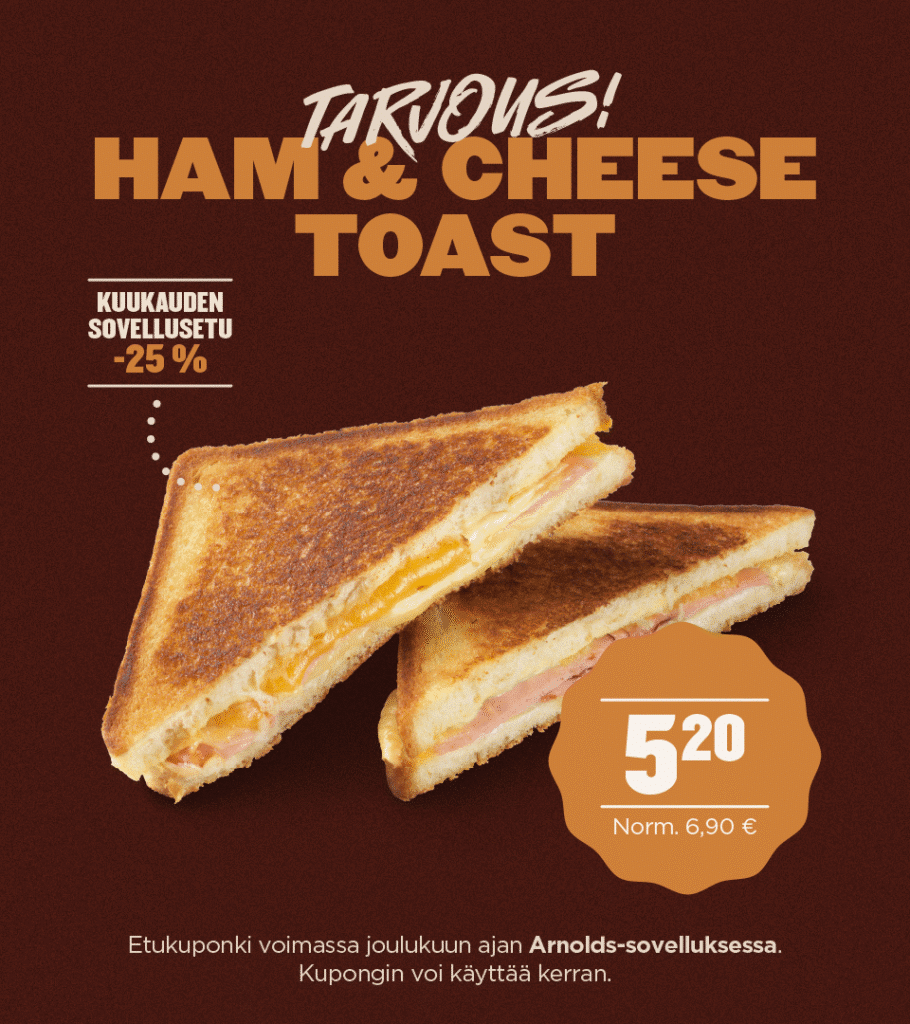 Joulukuun Arnolds-sovellusetuna Ham & Cheese Toast 5,20€ (norm. 6,90€)