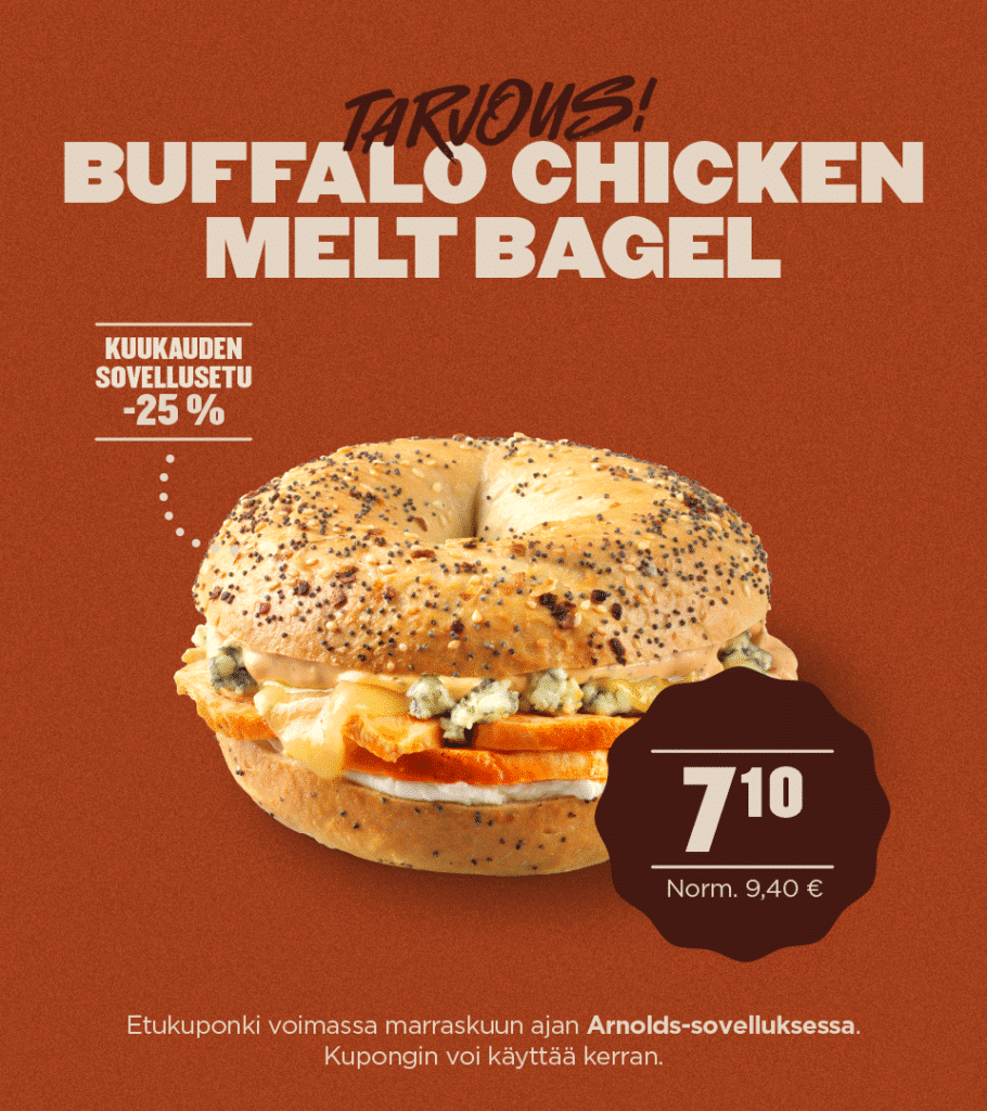 Marraskuun Arnolds-sovellusetuna Buffalo Chicken Melt -25 % 7,10€ (norm. 9,40€) Tervetuloa herkuttelemaan!